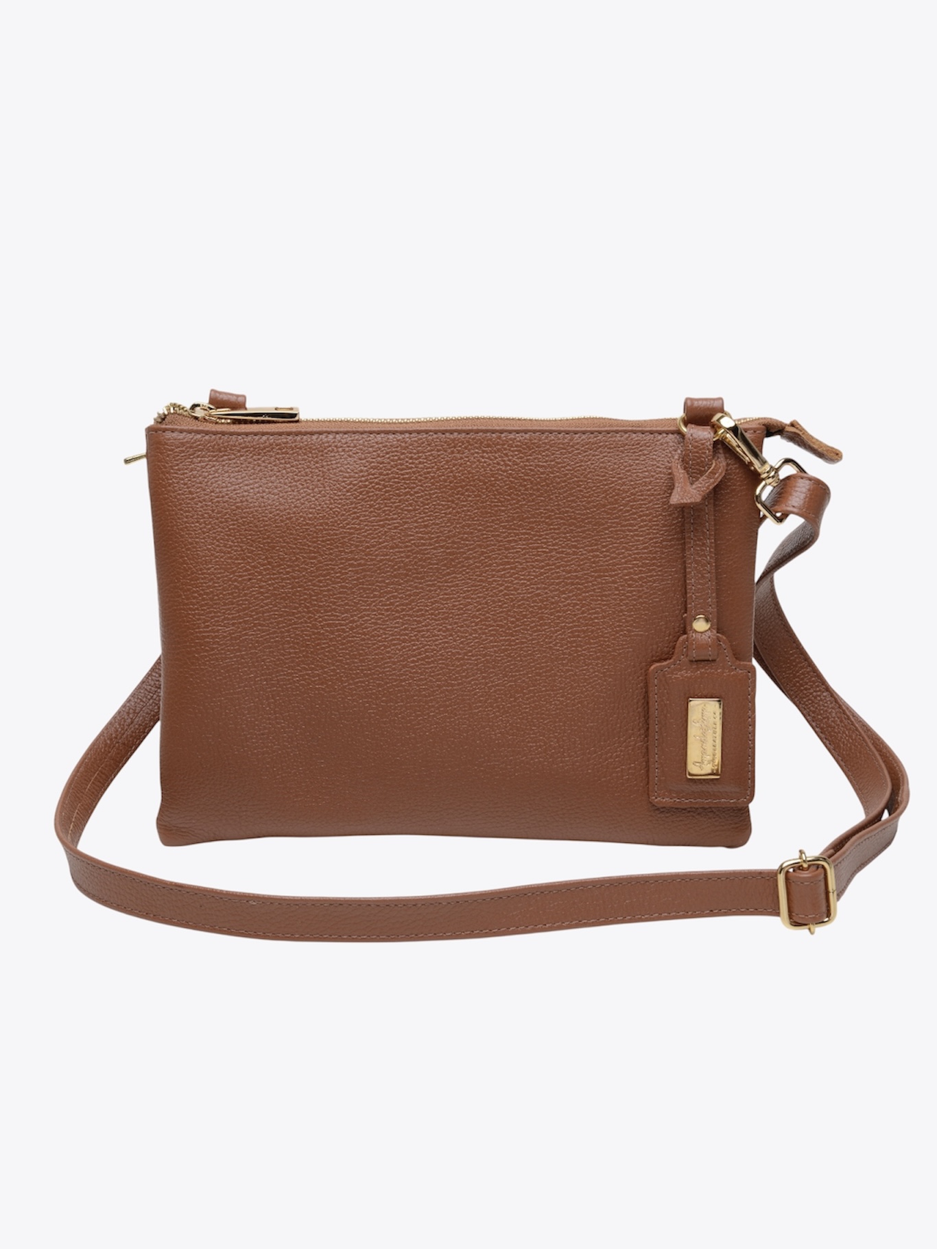 Bolsa Ava tamanho médio, em couro caramelo de toque macio. Modelo quadrado, com três repartições e compartimentos internos, fechamentos por zíper, tag da marca e alça transversal de 120 cm.
