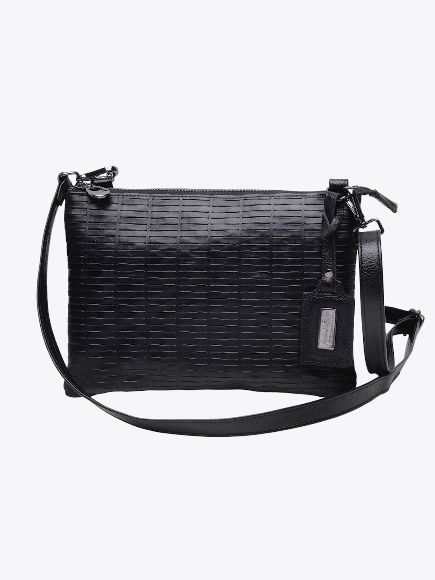 Bolsa Ava tamanho médio, em couro preto tressê tem toque macio. Modelo quadrado, com três repartições e compartimentos internos, fechamentos por zíper, tag da marca e alça transversal de 120 cm.