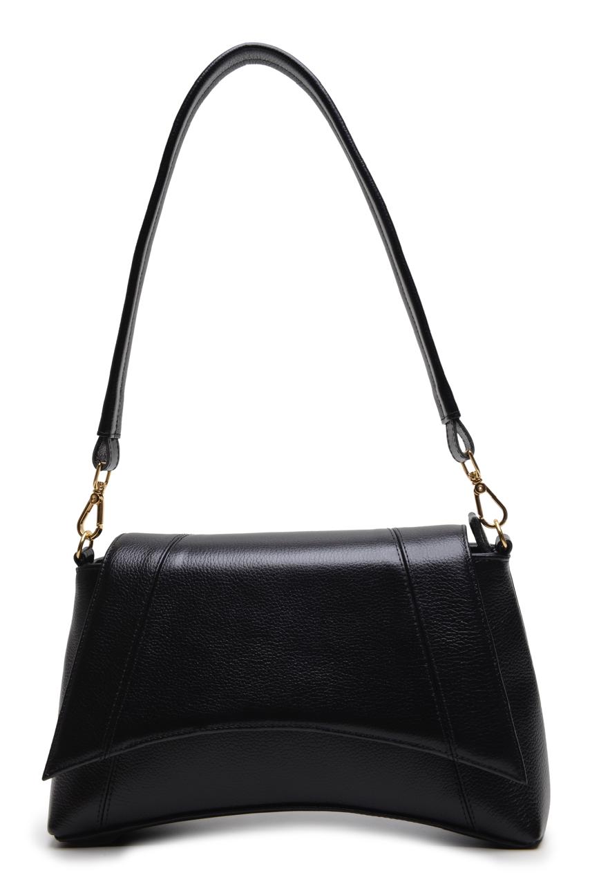 Bolsa estruturada em couro preto, tem o tamanho médio, feita em couro com leve brilho. Nos detalhes, ferragens contrastantes ouro. A peça possui uma alça de ombro confortável. O modelo conta também com divisões internas e zíper externo. O fechamento é feito por zíper e botões de pressão.