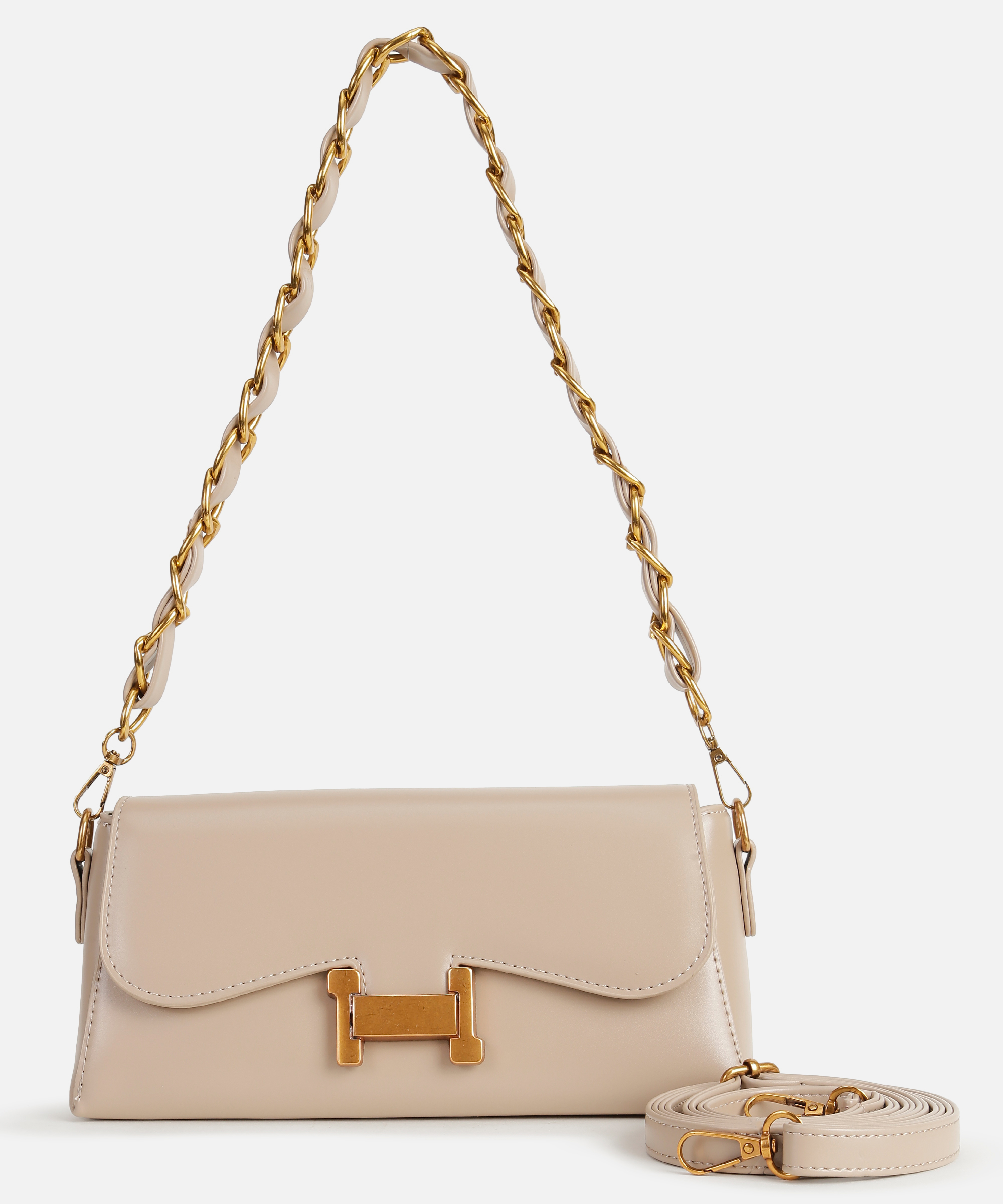 Bolsa estruturada taupe, tem o tamanho pequeno/médio, feita em material sintético com leve brilho. Nos detalhes, ferragens contrastantes. A peça possui uma alça de ombro com correntes e uma segunda opção de alça transversal de 120 cm. O modelo conta também com divisões internas e zíper. O fechamento é feito por zíper e botões de pressão.