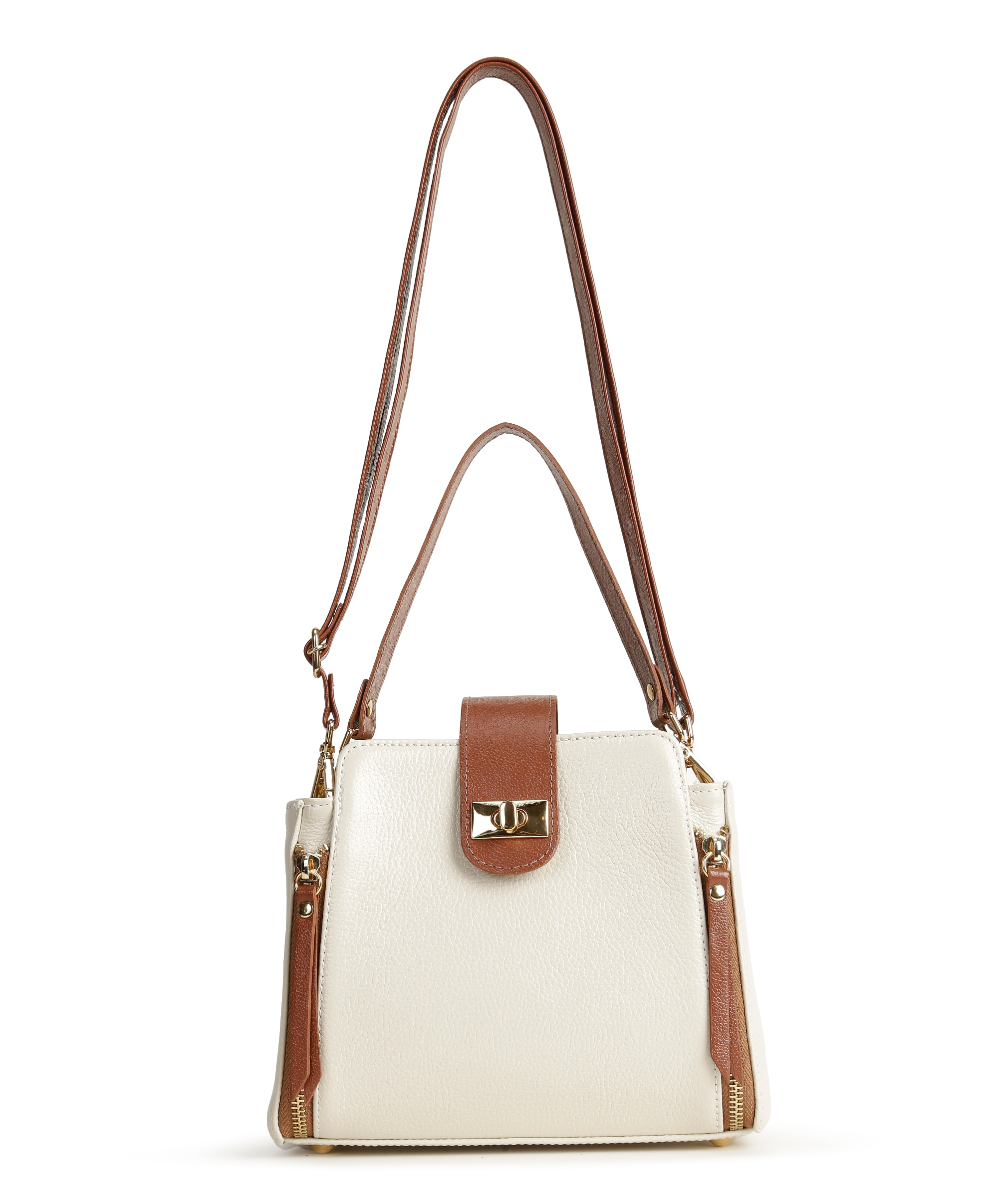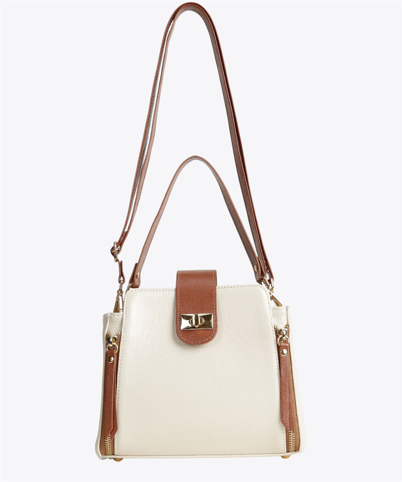 Bolsa baú com repartições em couro off white com detalhes em caramelo, tem o tamanho médio e couro com leve brilho. Nos detalhes, ferragens contrastantes e costuras. A peça possui uma alça de ombro de 120 cm e conta com 3 divisões com fechamento de zíperes e divisões externas.