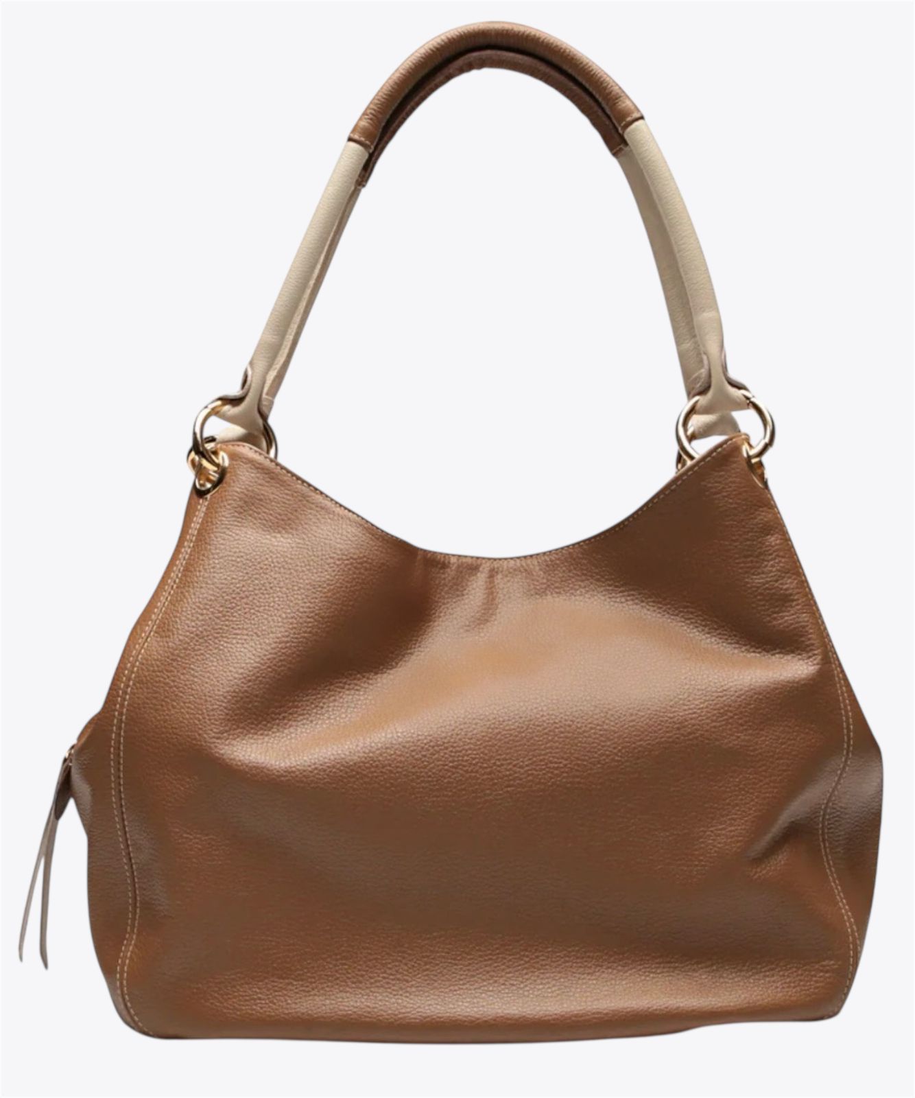 A bolsa Saco com divisórias em couro caramelo com detalhes em off white, conta com duas alças de ombro com rolitês redondos confortávies, três divisórias internas e uma divisória externa, aberturas com zíperes reforçados, forro em tecido e amplo espaço interno que acomoda desde objetos menores até itens maiores, como cadernos ou tablets.