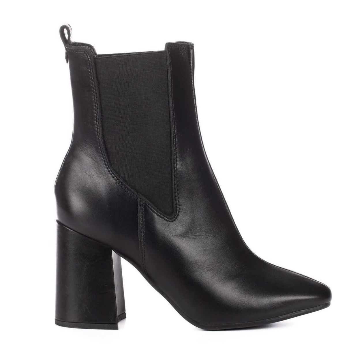 Bota bico quadrado preto, tem cano curto, salto alto bloco de 8 cm. Traz cabedal ajustado ao pé com elásticos. Com recorte pespontado no cano e solado de borracha com couro.