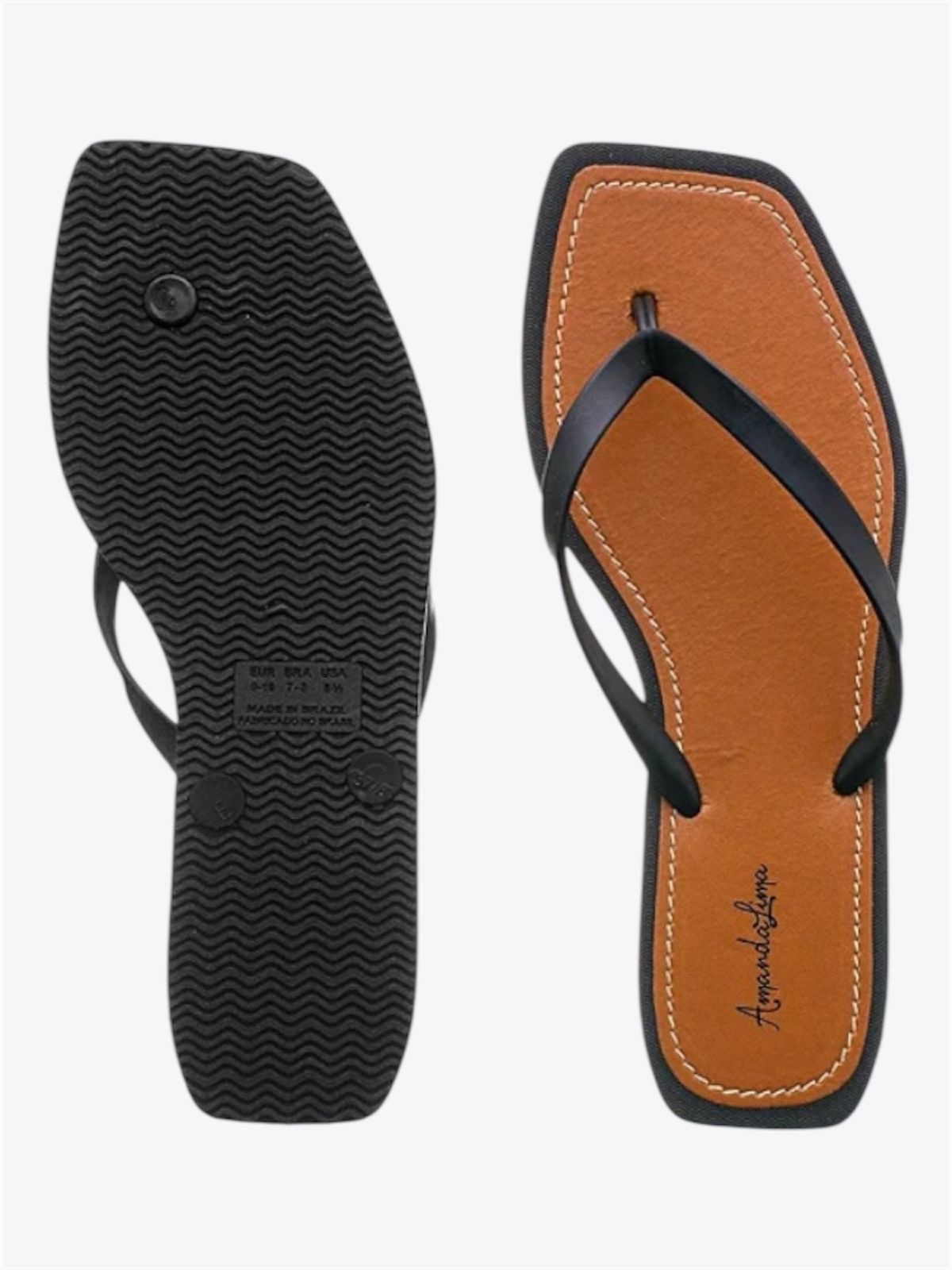 Chinelo colorido de borracha EVA. O modelo tem salto rasteiro e bico quadrado, traz tiras finas sobre os dedos e apresenta palmilha em material pespontado, sintético na cor caramelo. Exibe todo o pé.