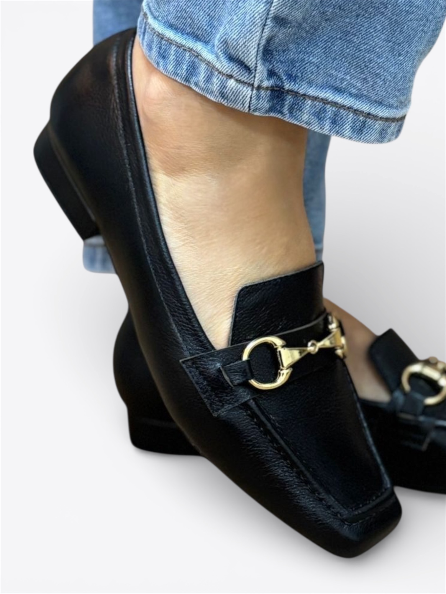 Loafer em couro preto. O modelo tem shape de bico quadrado, couro liso e detalhe de metal fivela clássica ouro, na gaspea, o salto quase rasteiro.