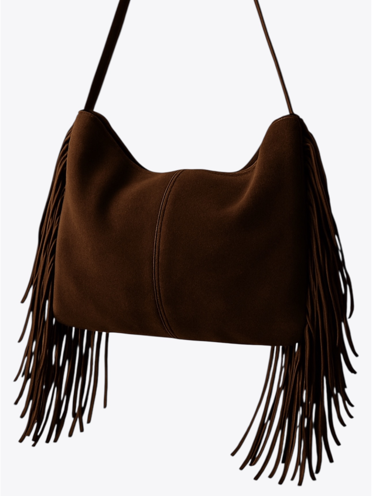 Bolsa estilo saco com franjas laterais, de couro camurça café, conta com uma alçade ombro grossa confortável, divisórias internas e uma divisória externa, fechamentos com zíperes reforçados, forro em tecido e amplo espaço interno que acomoda desde objetos menores até itens maiores, como cadernos ou tablets.