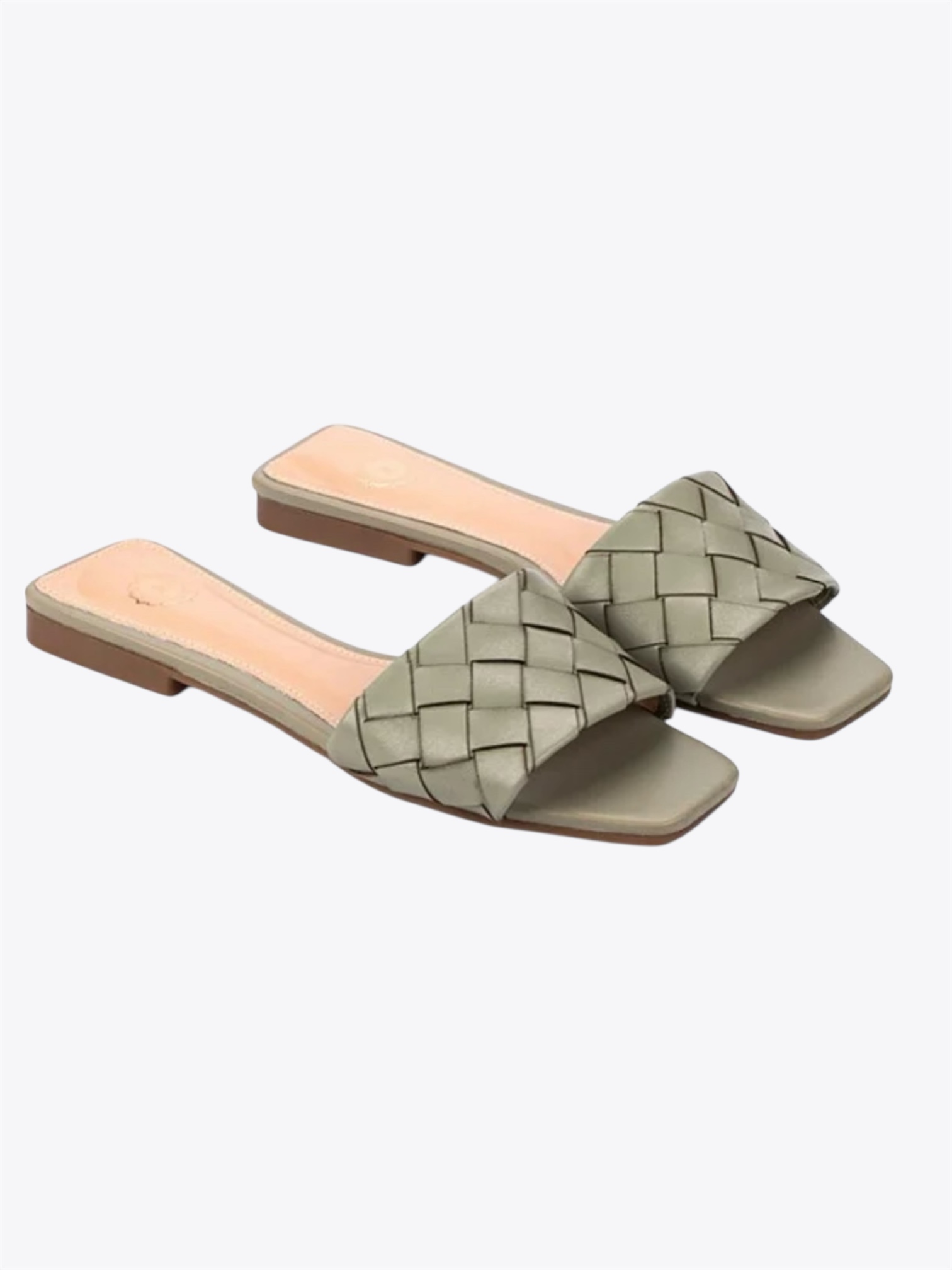 Sandália rasteira em couro legítimo. O modelo tem tira larga sobre o peito do pé com tiras tramadas. De bico quadrado, solado de borracha. Deixa dedos, laterais e calcanhar à mostra.