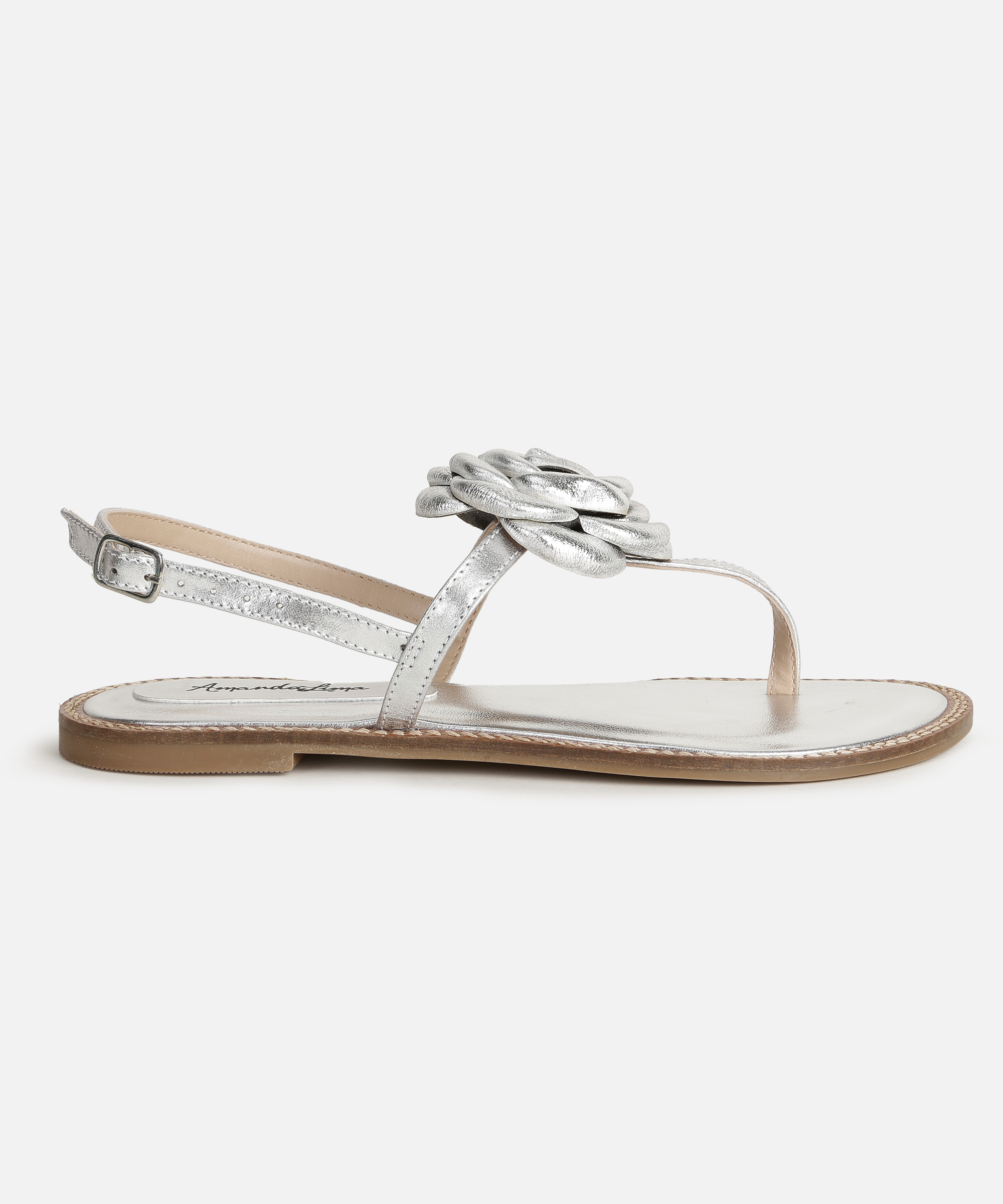 Sandália rasteira fio em couro metalizado prata, com aplicação de flor no cabedal. Possui fechamento em fivela de ajuste e solado de borracha.