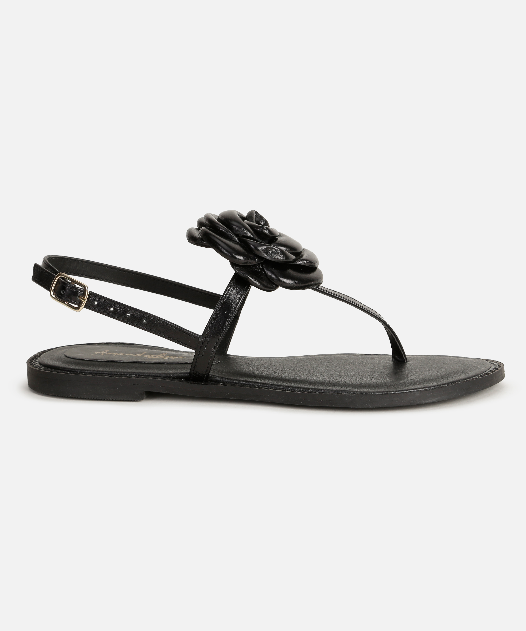 Sandália rasteira fio em couro preto, com aplicação de flor no cabedal. Possui fechamento em fivela de ajuste e solado de borracha.