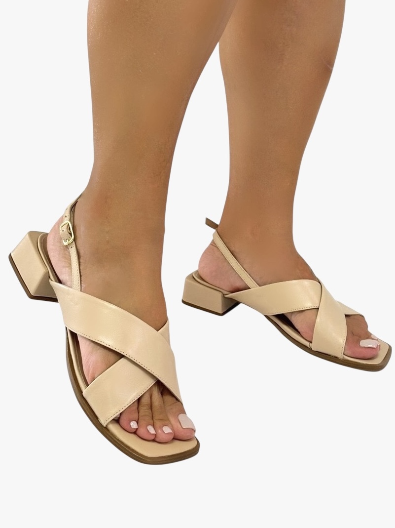 Sandália Cross em couro legítimo nude. O modelo tem cabedal composto por duas tiras largas que cobrem o peito do pé, salto quadrado confortável. De bico quadrado deixa dedos e calcanhar à mostra.
