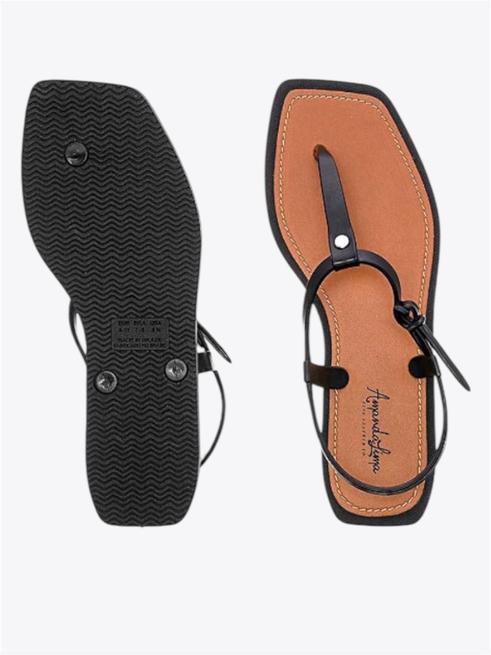 Sandália colorida de borracha EVA. O modelo tem salto rasteiro e bico quadrado, traz tiras finas sobre os dedos e apresenta palmilha em material pespontado, sintético na cor caramelo. Exibe todo o pé.