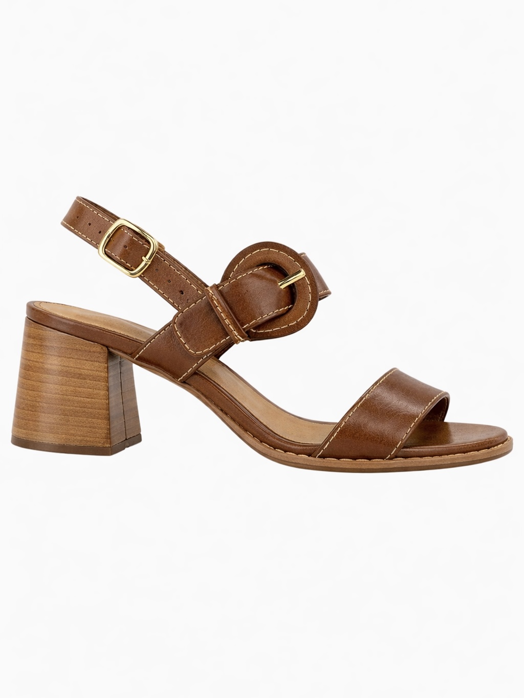 Sandália em couro caramelo conhaque, com salto bloco quadrado médio de madeira. Modelo de bico redondo possui duas tiras na gáspea, e pulseira no tornozelo com ajuste de fivela encapada. Metais discretos dão acabamento para a amarração.