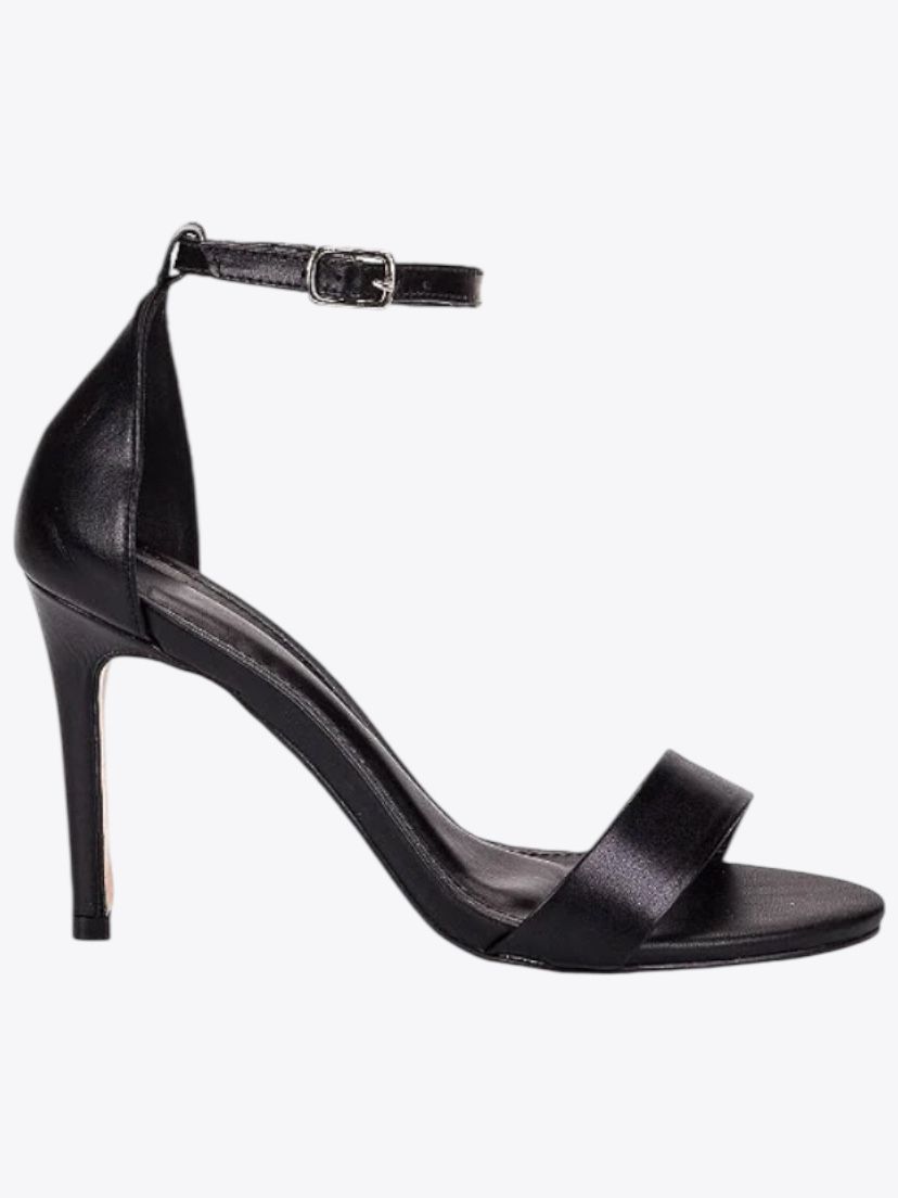 Sandália Gisele em couro. O modelo tem salto fino de 9 cm. Traz cabedal com tira larga e peça no calcanhar com amarração feita por fivela de metal.