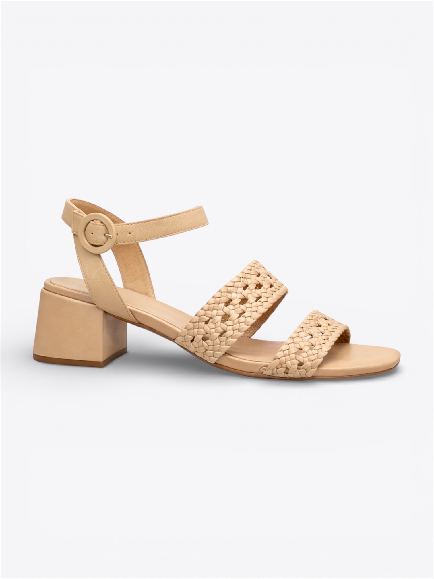 Sandália em couro nude, com salto quadrado. Modelo de bico quadrado, traz cabedal composto por tiras trançadas, com fecho de fivela fina, banho ouro no tornozelo. O salto quadrado é confortavel e moderno.