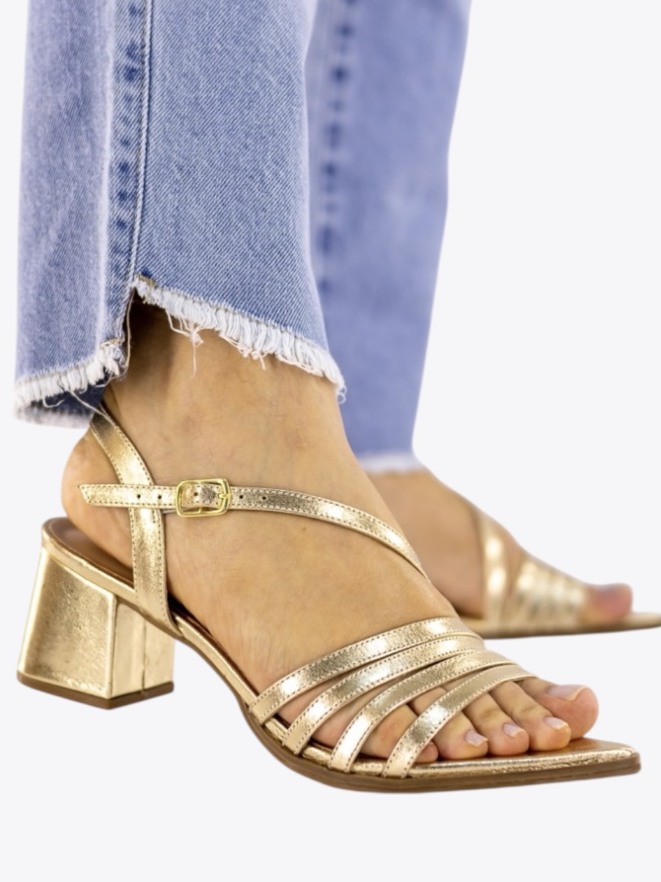 Sandália em couro ouro light e detalhes de tiras, com salto bloco quadrado médio. Modelo de bico folha, possui tiras na gáspea, e pulseira no tornozelo com ajuste de fivela. Metais discretos dão acabamento para a amarração.