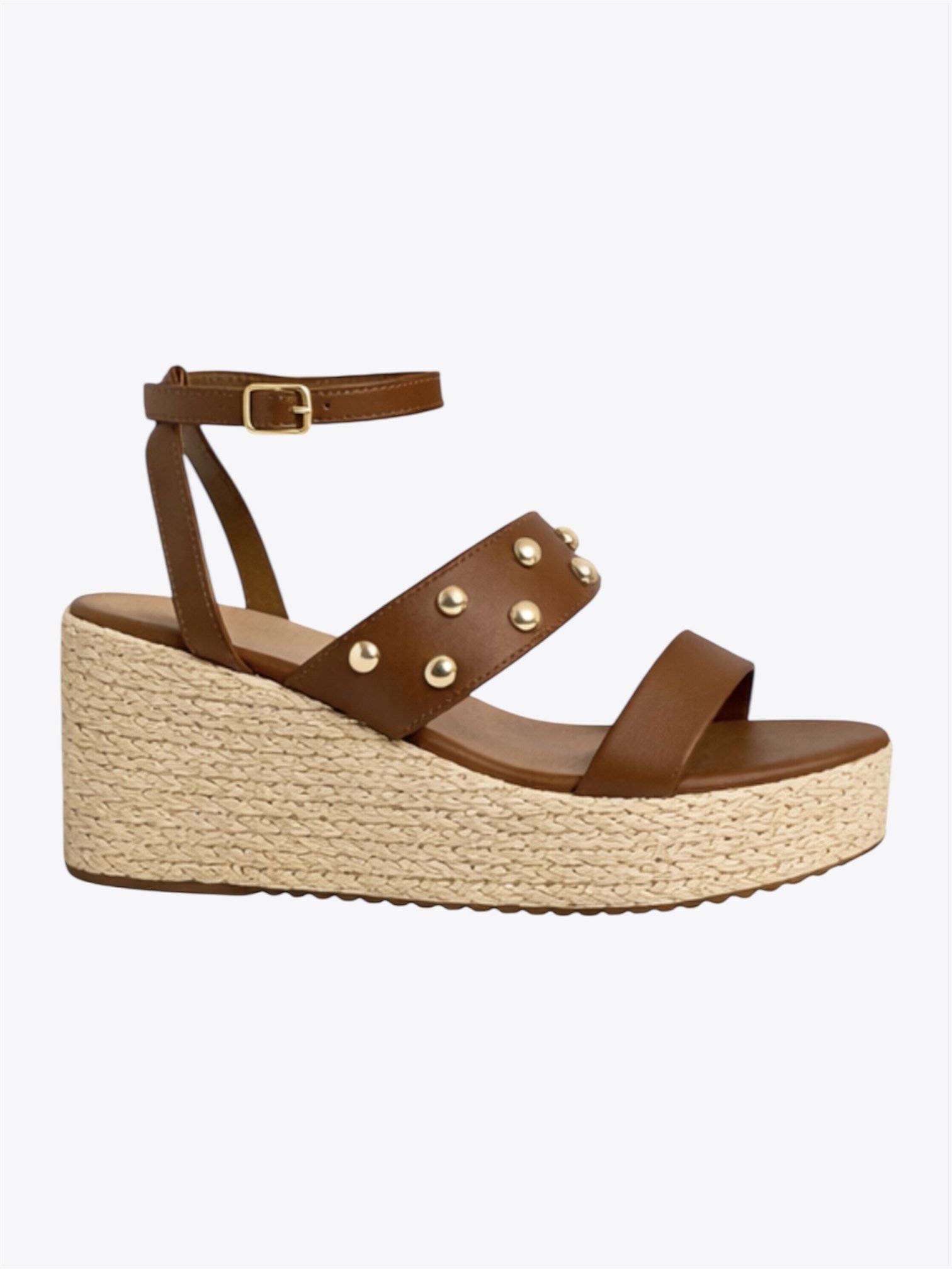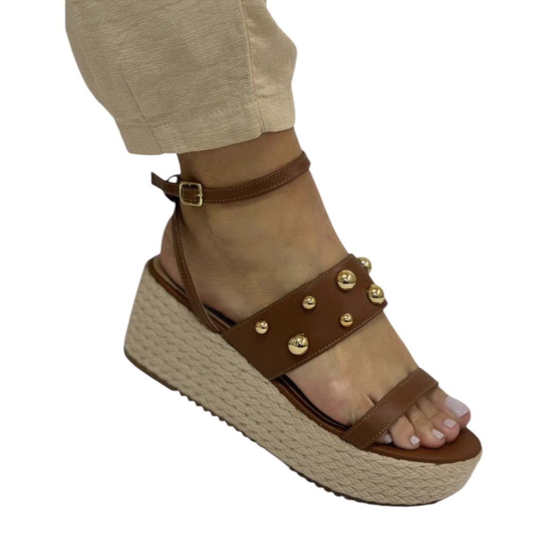 Sandália em couro caramelo, com salto plataforma revestido com corda. Modelo de bico redondo, traz cabedal composto por tiras e detalhes de spikes ouro, com fecho de fivela fina, banho ouro no tornozelo. O salto plataforma é confortavel e moderno.