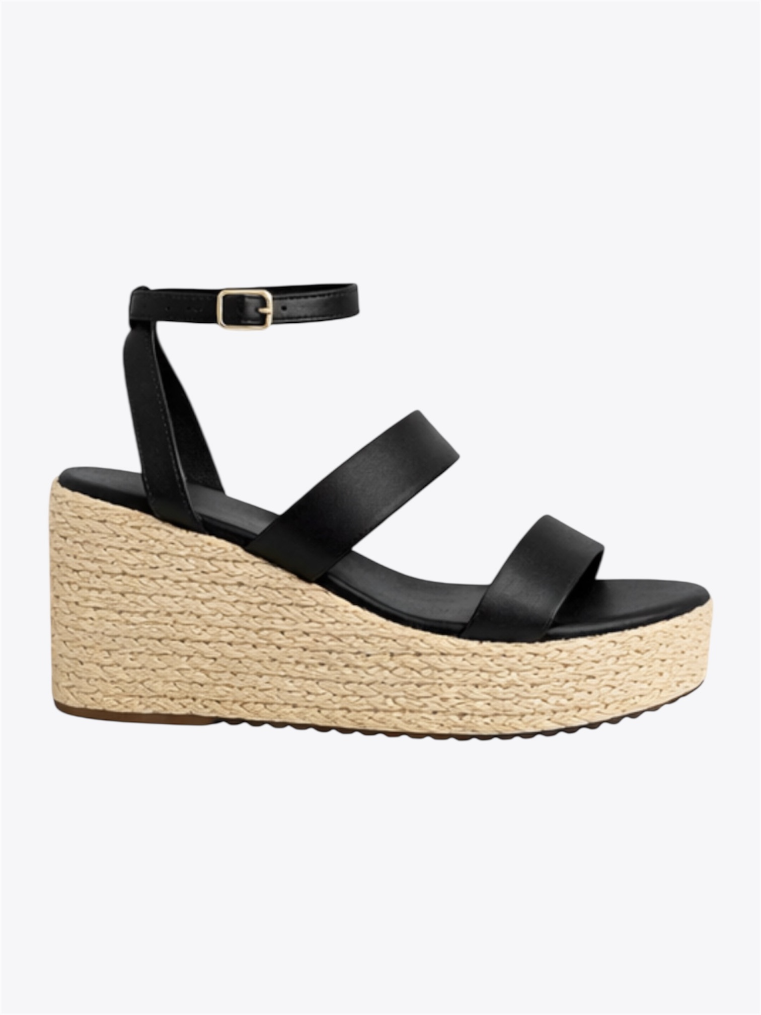 Sandália em couro preto, com salto plataforma revestido com corda. Modelo de bico redondo, traz cabedal composto por tiras, com fecho de fivela fina, banho ouro no tornozelo. O salto plataforma é confortavel e moderno.