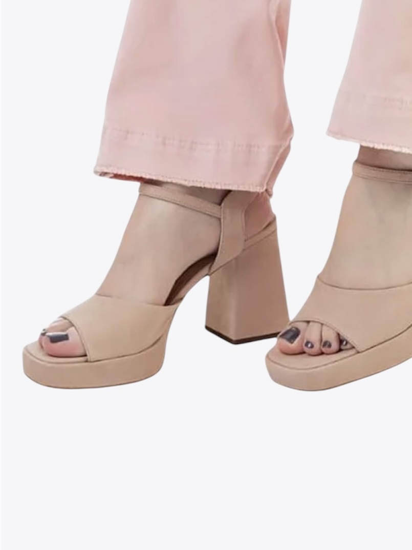 Sandália plataforma couro camurça nude. Modelo de bico quadrado, traz cabedal composto por uma tira larga, aberta na parte traseira, tem fecho em tira fina afivelada com banho ouro no tornozelo.