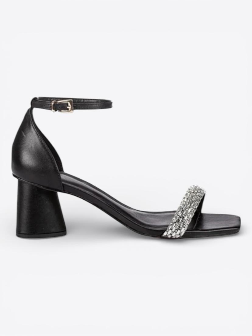 Sandália em couro preto, com salto bloco oval médio. Modelo de bico quadrado possui tira na gáspea com detalhe de brilho e pulseira no tornozelo com ajuste de fivela. Metais discretos dão acabamento para a amarração.