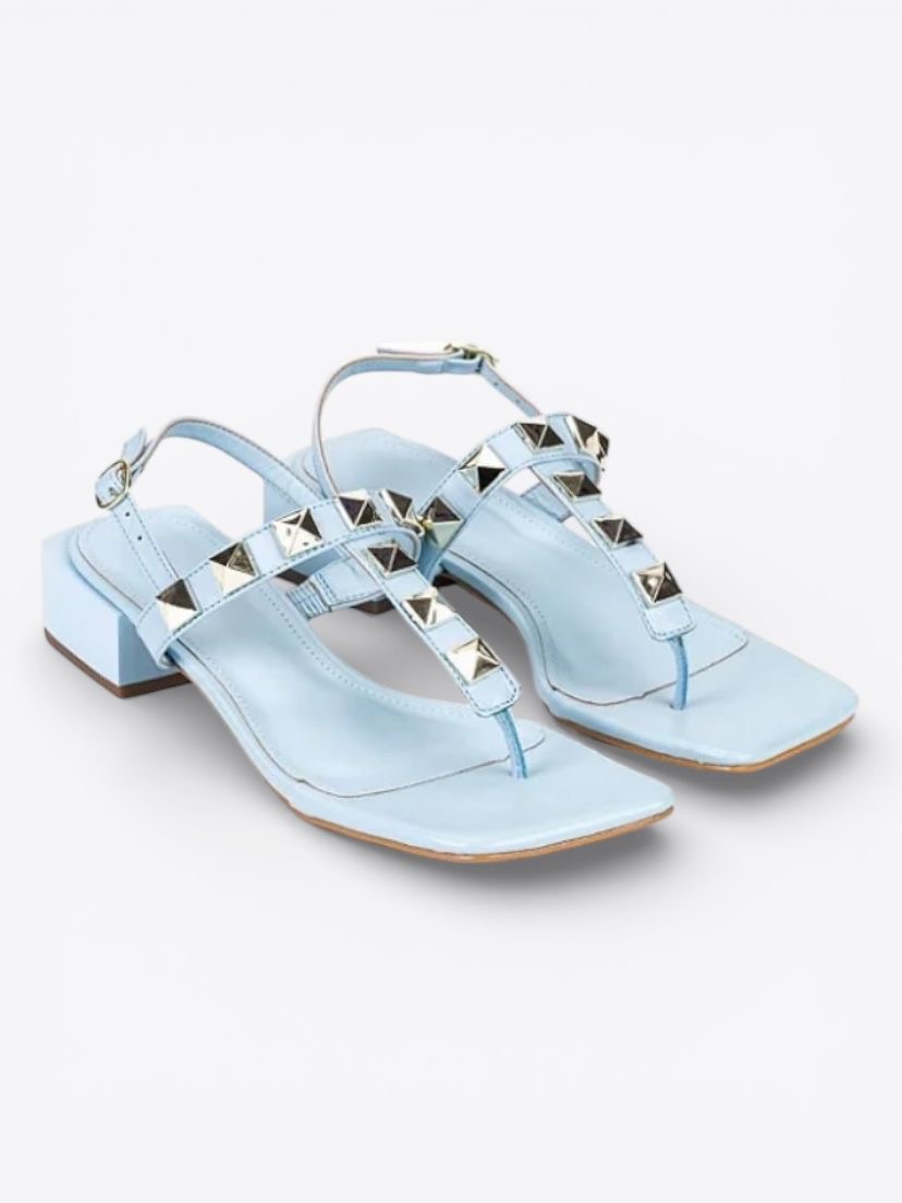 Sandália spikes azul de bico qudrado e salto quadrado baixo em couro legítimo, modelo fio no peito dos pés com aplicaçoes de spikes em metal dourado. Possui fechamento em fivela de ajuste e solado de borracha.