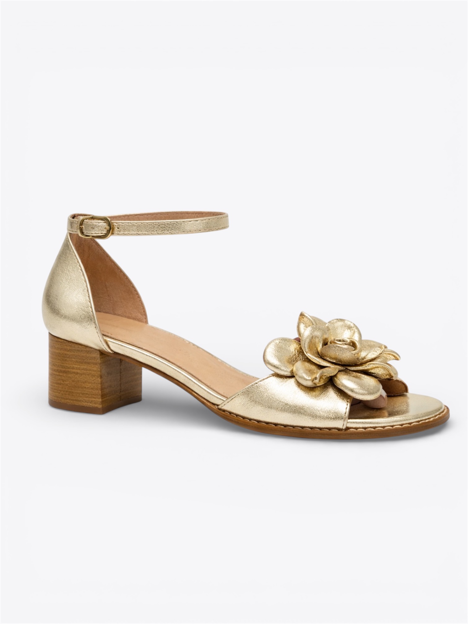 Sandália flor em couro metalizado dourado, salto médio em madeira bloco, modelo com tira no peito dos pés e aplicação de flor em couro, no mesmo material. Possui fechamento em fivela de ajuste e solado de borracha.