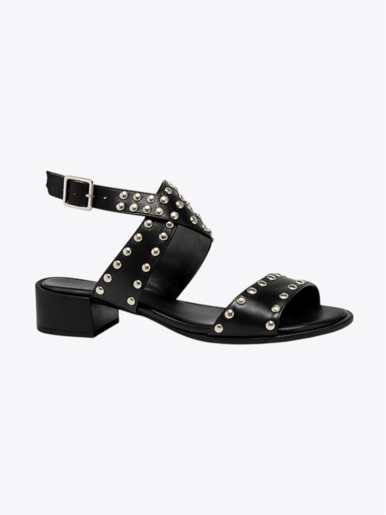 Sandália em couro preto, com salto quadrado em madeira. Modelo de bico quadrado, traz cabedal composto por tiras largas trançadas e detalhes com spikes pratas.