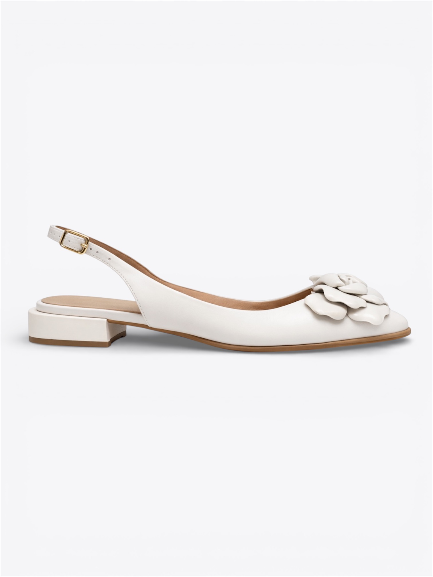 Sapatilha em couro legítimo. O modelo tem bico fino e salto rasteiro. Traz contorno superior em destaque, e abertura na parte traseira do cabedal, possui detalhe de flor. Com solado injetado e sobreposição em material emborrachado na parte de trás.