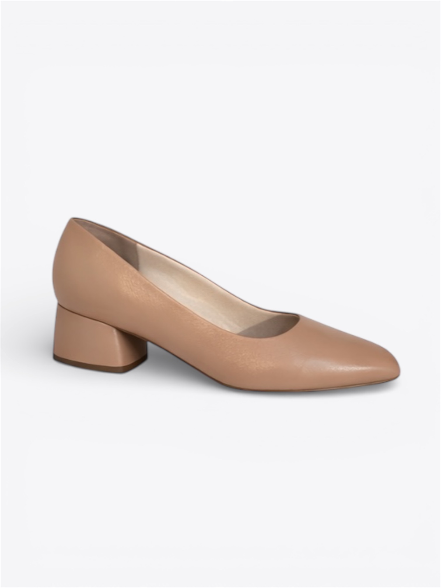 Sapato scarpin em couro legítimo. O modelo tem bico quadrado e salto médio. Traz contorno superior em destaque, fechado na parte traseira do cabedal. Com solado injetado e sobreposição em material emborrachado na parte de trás.