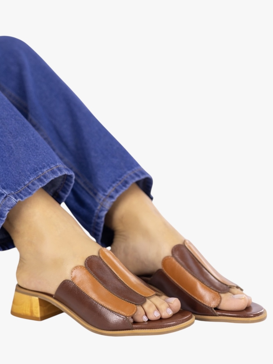 Tamanco tons terrosos em couro com toque macio, o modelo é composto por tiras largas desenhadas com recortes verticais em couro com tons de caramelo e café, salto quadrado tamanho cm e forma quadrada, trend da estação e deixa o pé aparente.