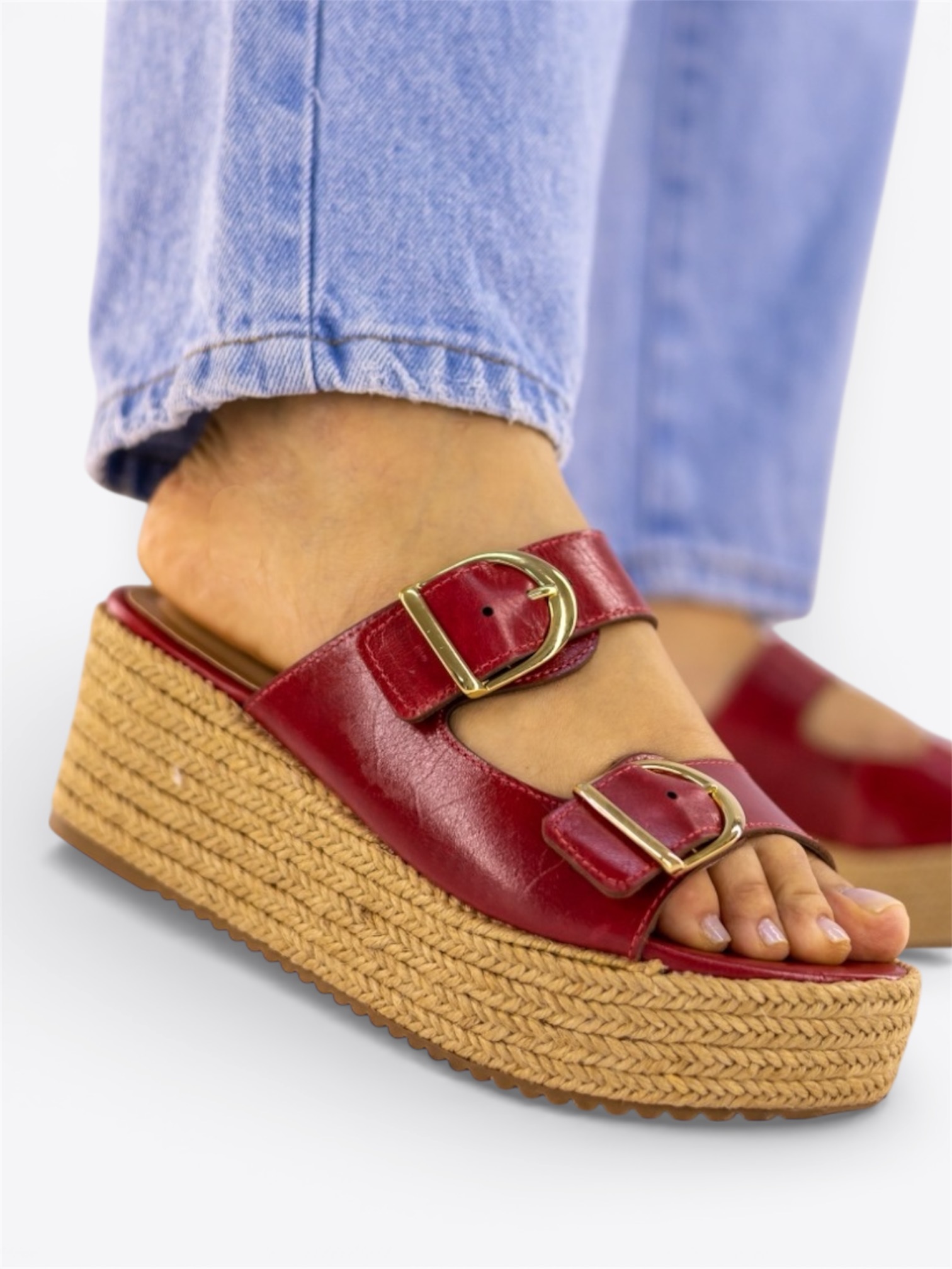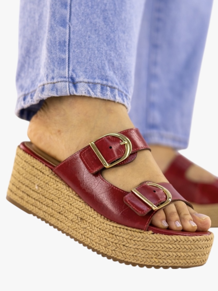 Tamanco em couro vermelho, com salto plataforma revestido com corda. Modelo de bico redondo, traz cabedal composto por tiras, com fecho de fivela, banho ouro. O salto plataforma é confortavel e moderno.