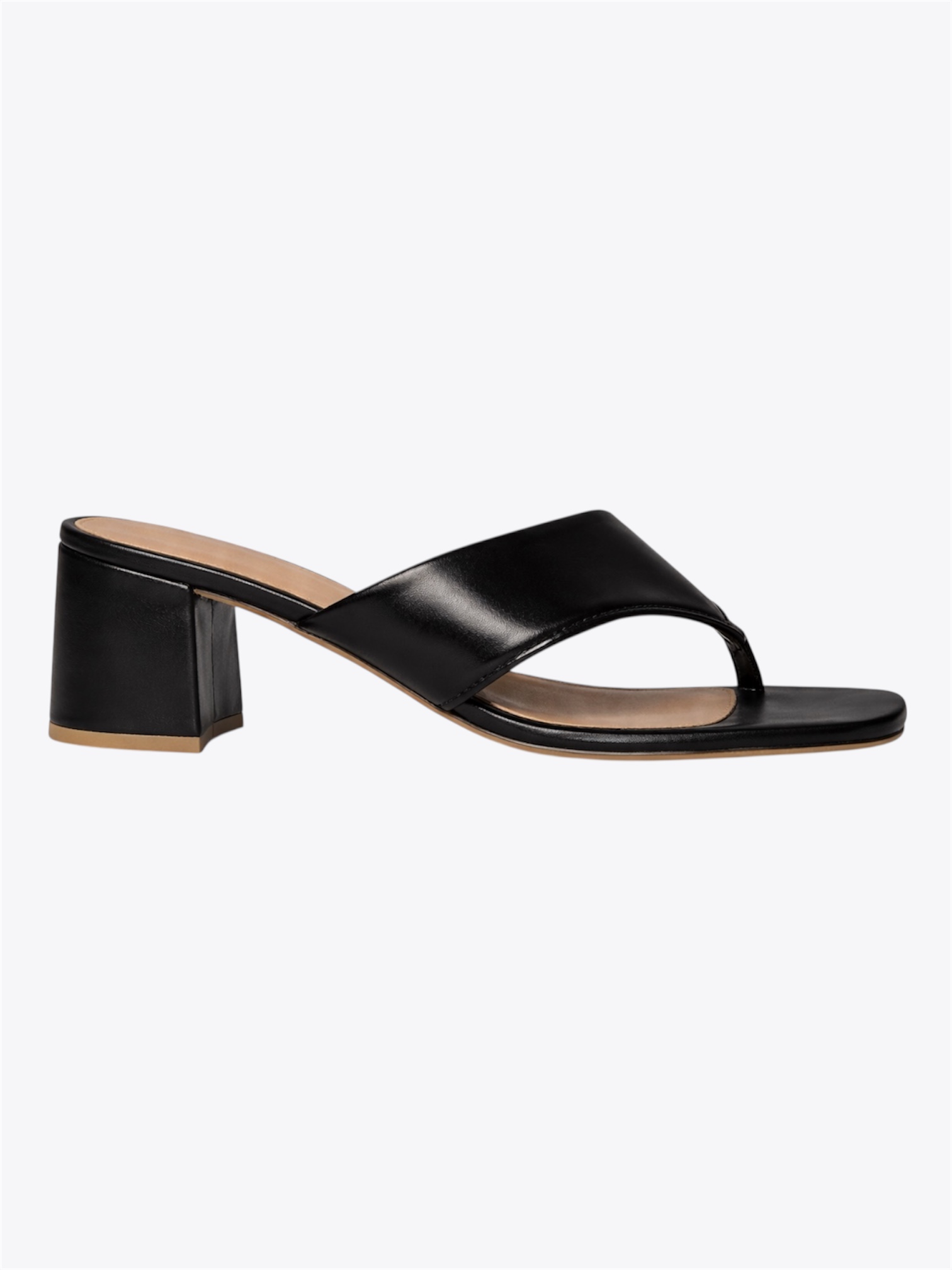 Tamanco dedo preto. O modelo tem bico quadrado salto de 6 cm. Traz faixas grossas superiores com almofadas em destaque, sobre o cabedal e pés a mostra.