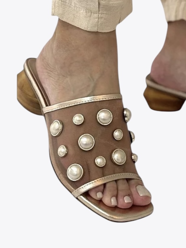 Tamanco em couro metalizado com toque macio, o modelo é composto por tira larga em tecido vazado, com aplicação de detalhe em pérolas, salto redondo de madeira tamanho 4 cm, forma quadrada, trend da estação e deixa o pé aparente.