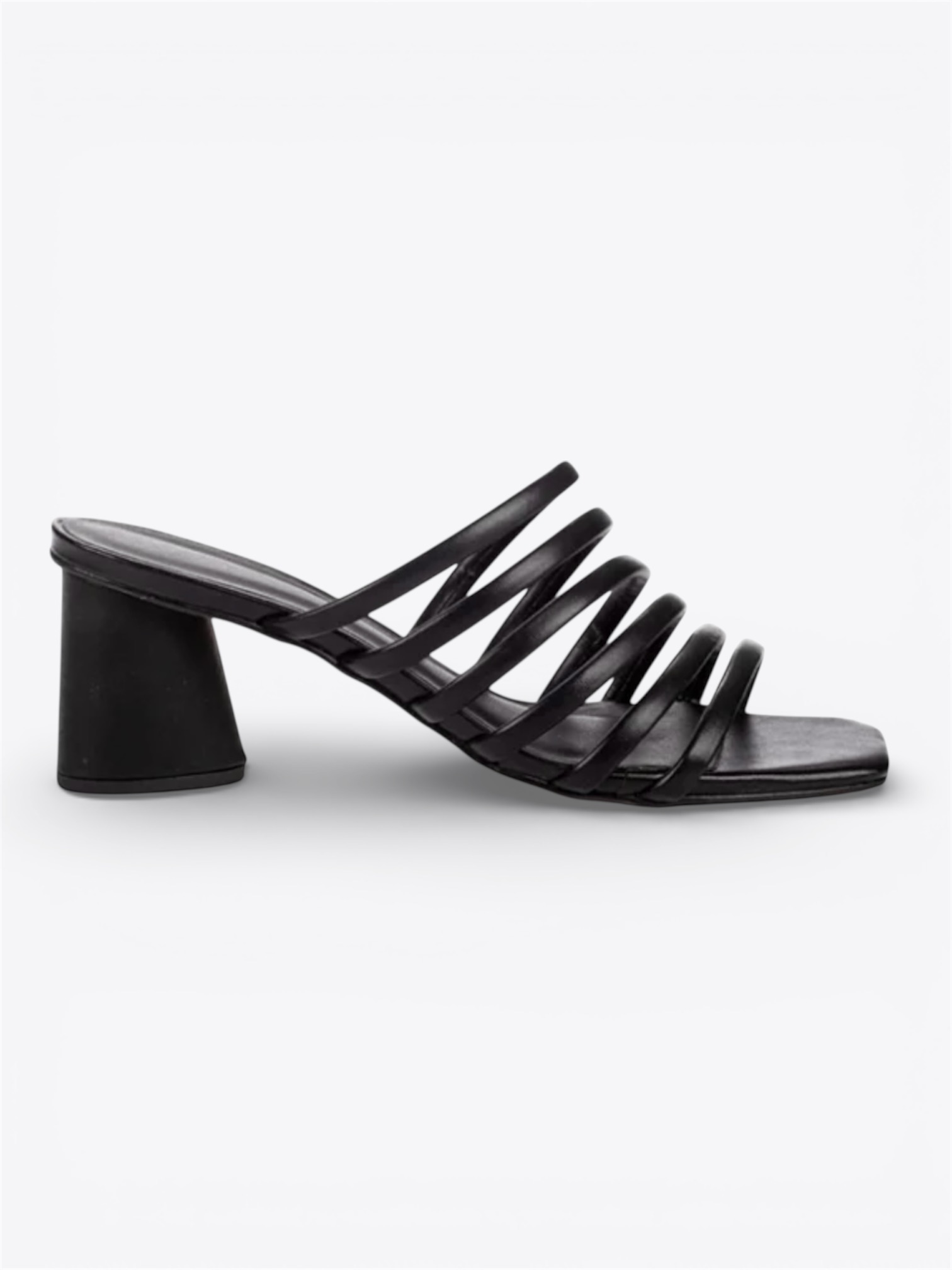 Tamanco em couro preto, com salto bloco quadrado médio. Modelo de bico redondo, possui tiras no peito do pé.