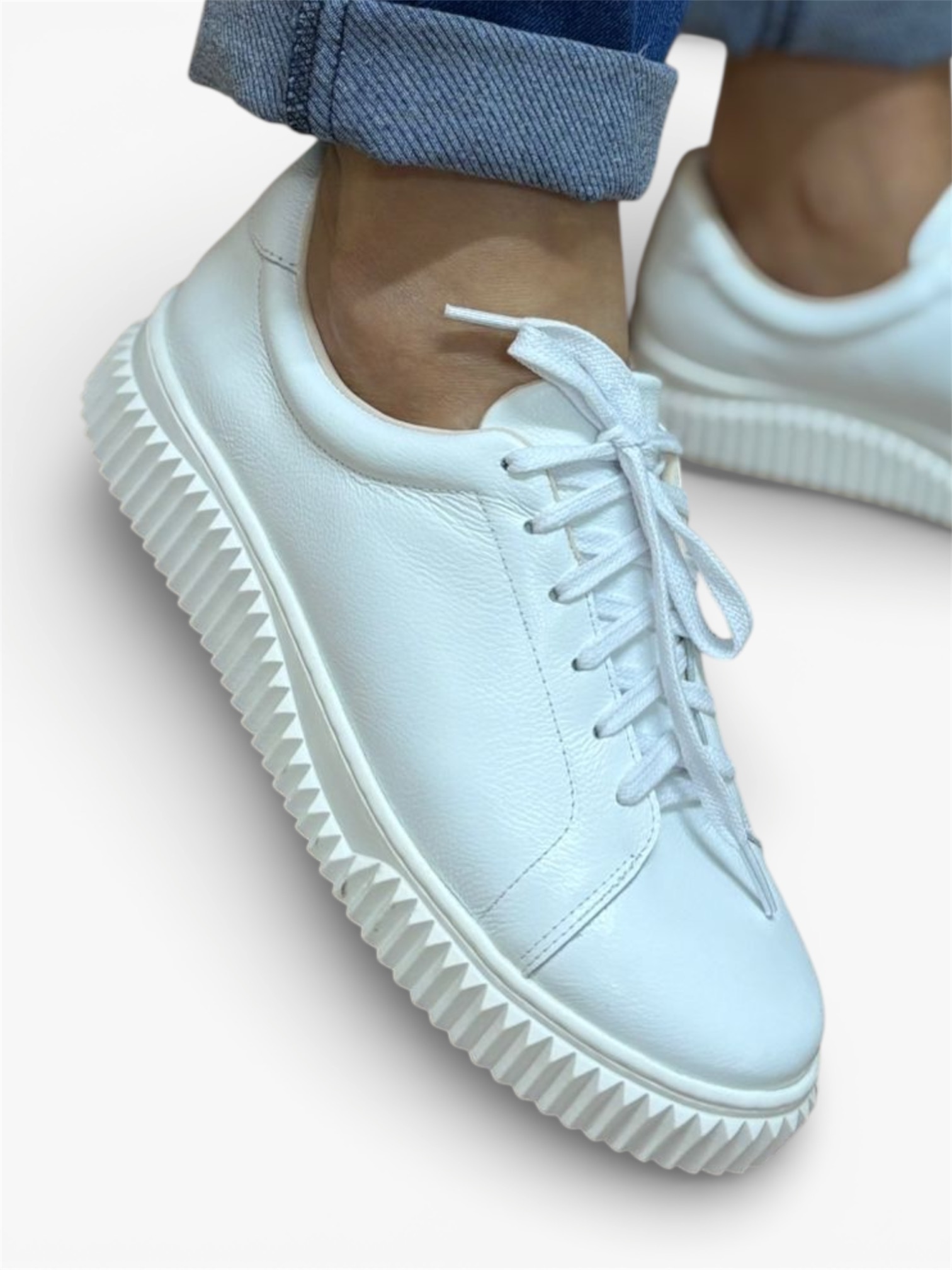 Tênis em couro legítimo branco, o modelo tem bico redondo. Traz contorno superior em destaque, sobre o cabedal e fechamento com cordão de algodão. Solado injetado de EVA e sobreposição em material emborrachado para proporcionar conforto aos pés.