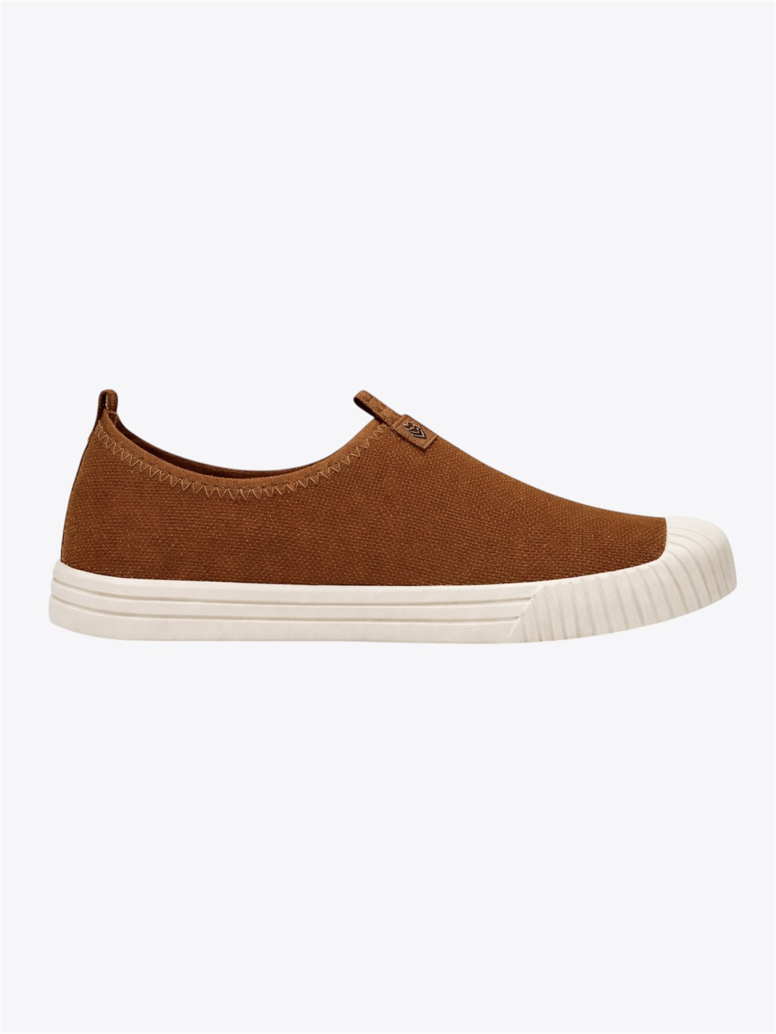 Tênis em tecido caramelo, o modelo tem bico redondo. Traz contorno superior em destaque. Solado injetado de EVA e sobreposição em material emborrachado para proporcionar conforto aos pés.